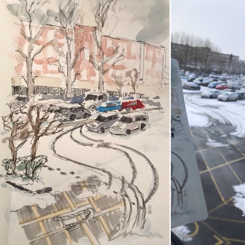 Grabbed a few minutes for a quick sketch of the snow this morning. More ‘chiffon scarf’ than a ‘blanket’ covering, but a good try for Brighton. All gone by the end of the day though.