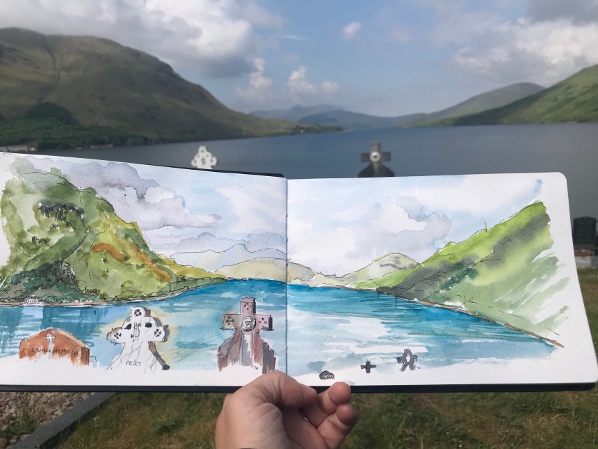 Traditional watercolour landscapes are not my forte, but this stunning spot in the graveyard above Killary Harbour fjord gave me itchy aqua brushes. Sometimes you just have to try!