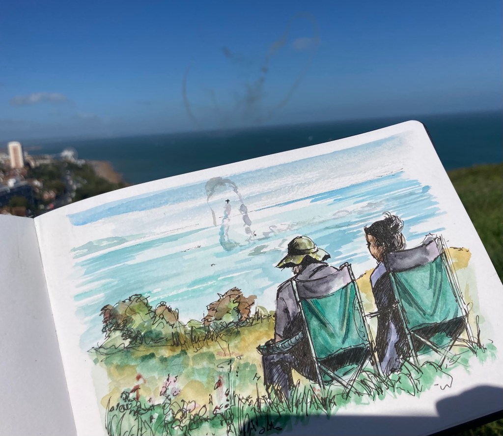 Watched by tiny spectators. Eastbourne airborne from Cuckmere Haven.