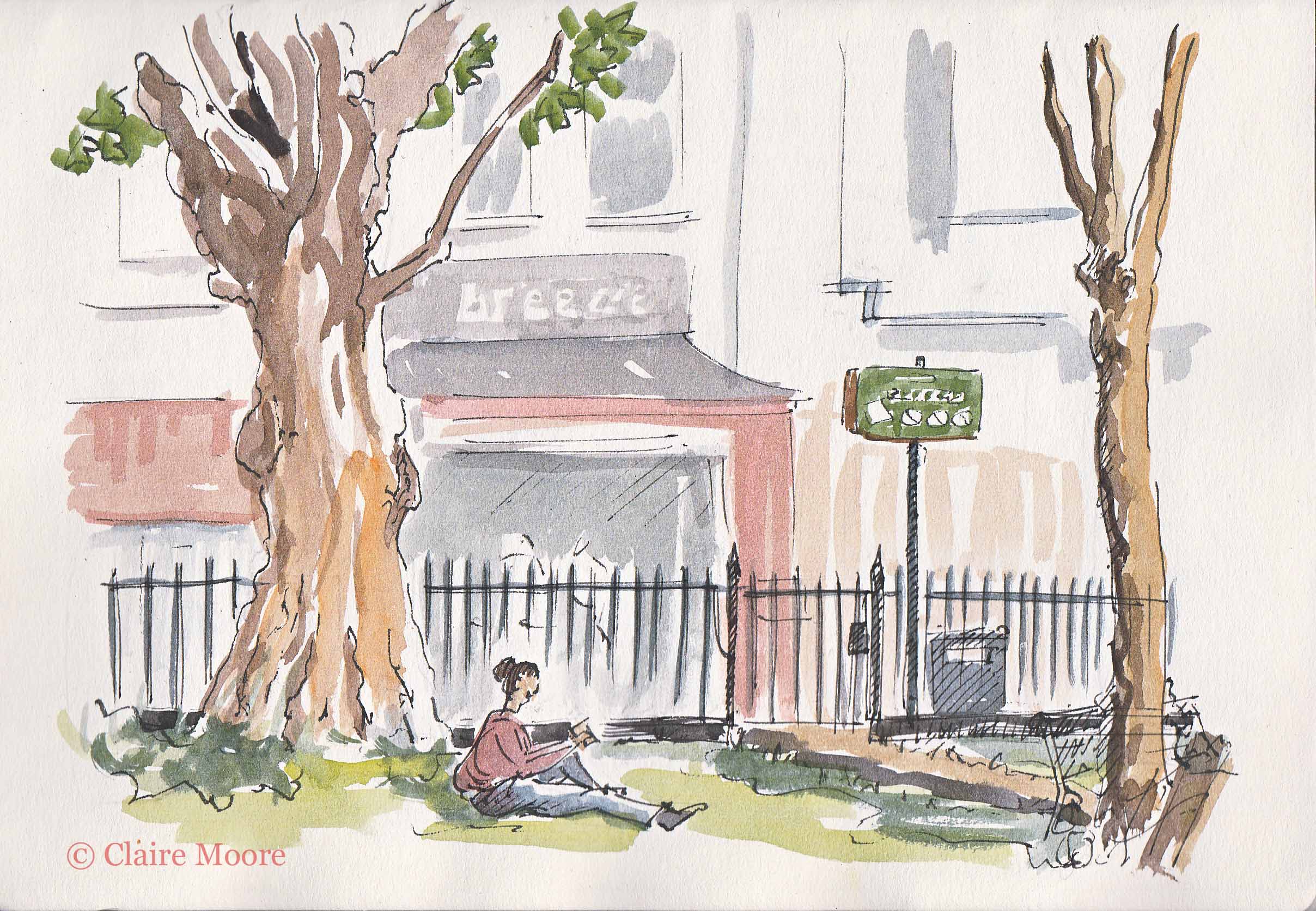 After parking up at the NCP, Roy heads to Pelham Square on Trafalgar Street, where he bumps into Terry Biglow, the dodgy ‘under-belly-world-criminal’. When I painted this, there was just a lady quietly eating a smoked salmon sandwich, so capturing the sinister undertones was tricky.