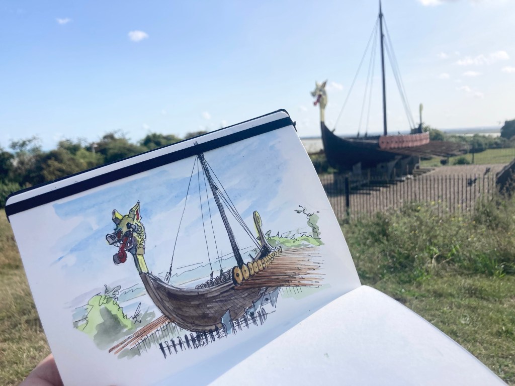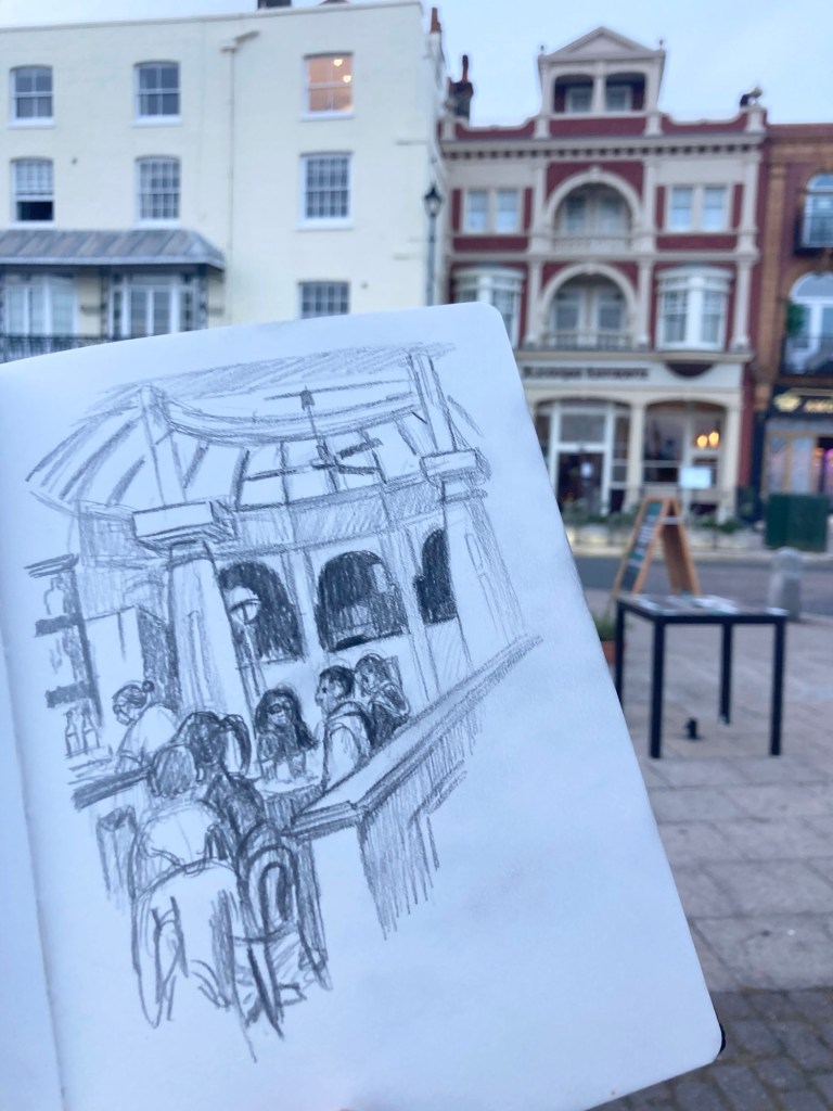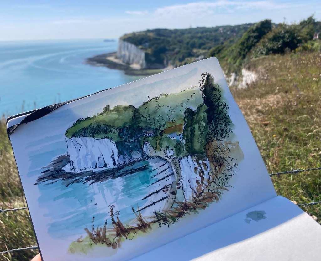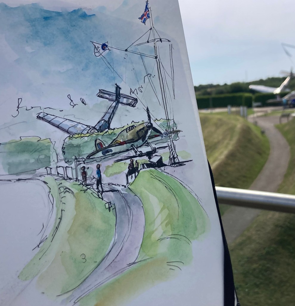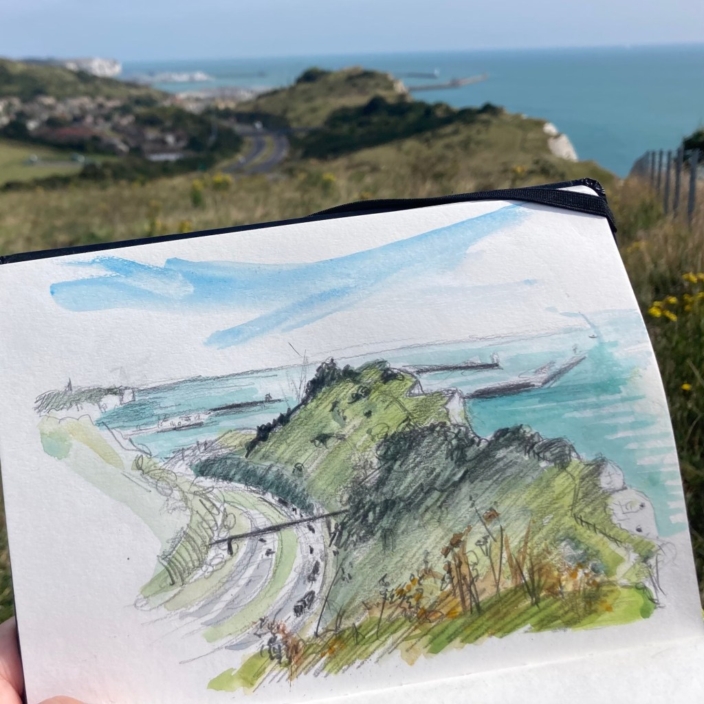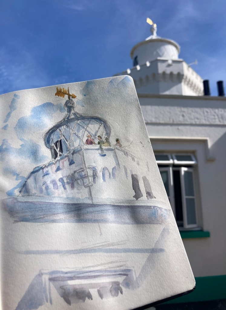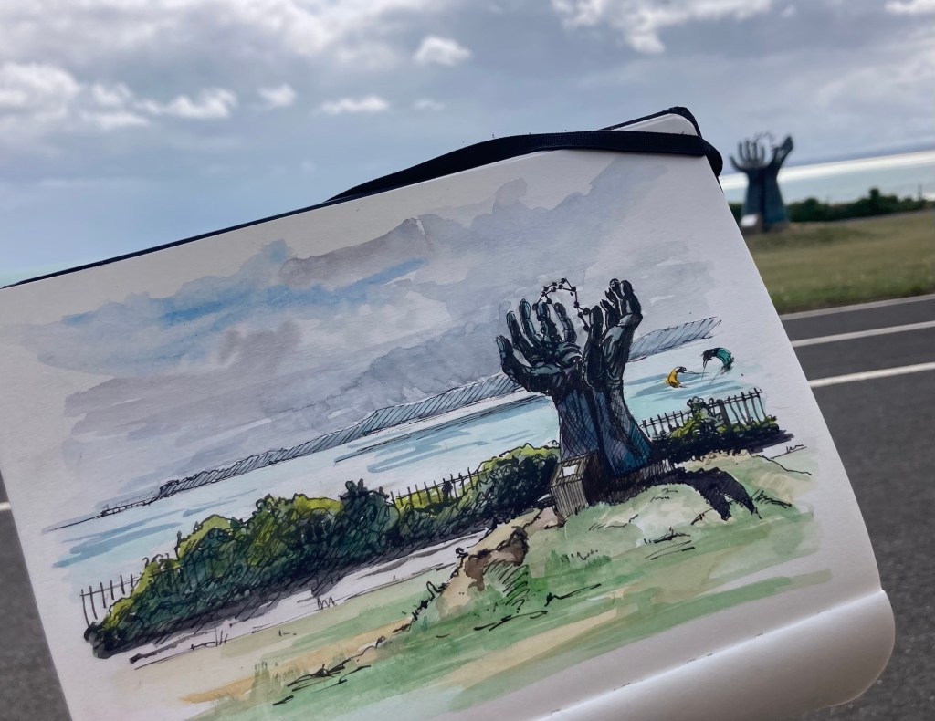Sketching in Botany Bay was aborted due to a freak shower, instead I cowered with 20 others in a tiny open shelter whilst the wind farm faded from view behind black skies. Thanks BBC weather.