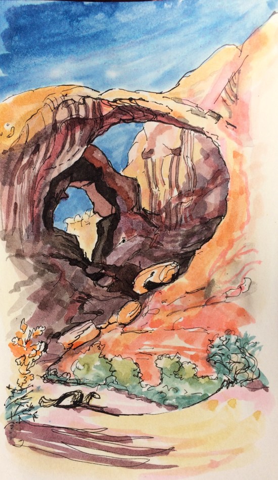 I am Boba Fett perched at the Great Pit of Carcoon, and the Sarlacc is belching below me. At least it feels that way as I sit clinging to my rucksack and ink pots, terrified my sketchbook, or me, will slide down the 45 degree slope and into the sheer drop below.