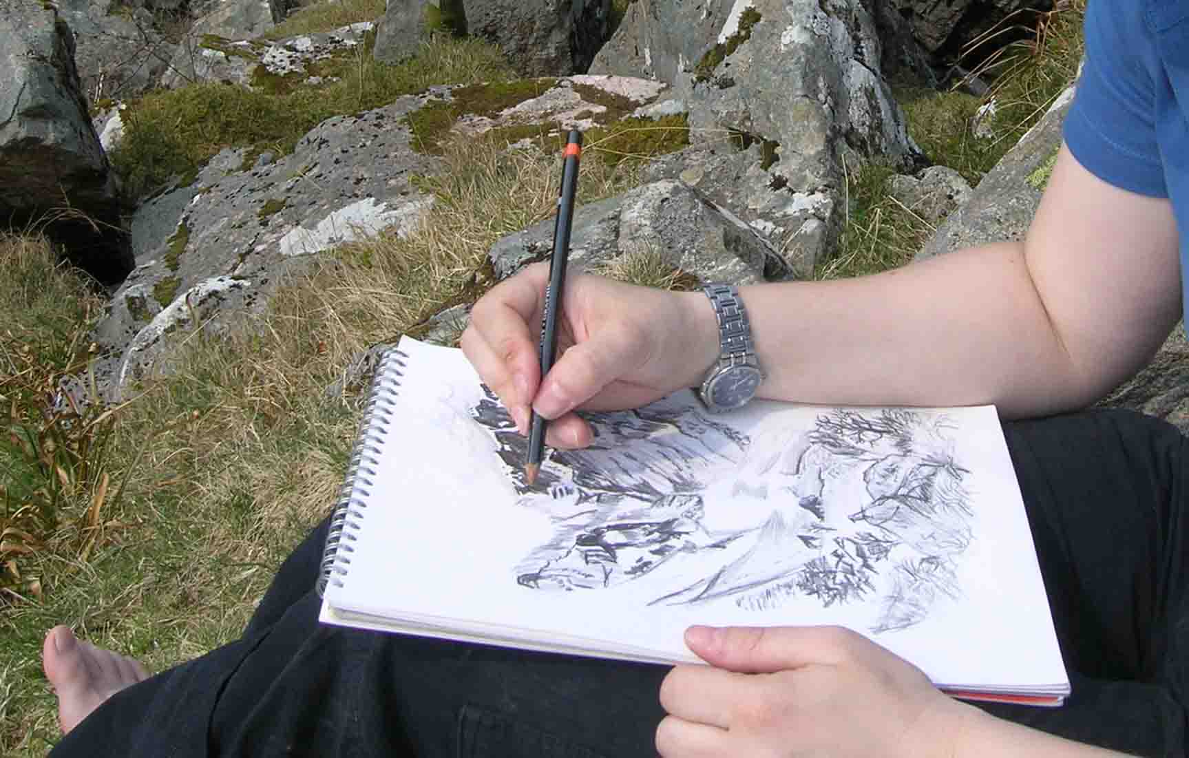 Up to that point, drawing was just something I did to pass time when I visited my parents at Christmas. I had a small, slightly weird collection of pencil ‘still lives’ – odd shoes, misshapen candles, a Swedish Christmas gnome etc. Sometimes I’d bring a sketch pad and pencil on holiday, but it generally stayed unused in my bag. However, this time, it was so quiet that I plucked up courage, pulled out my pad and captured the view.