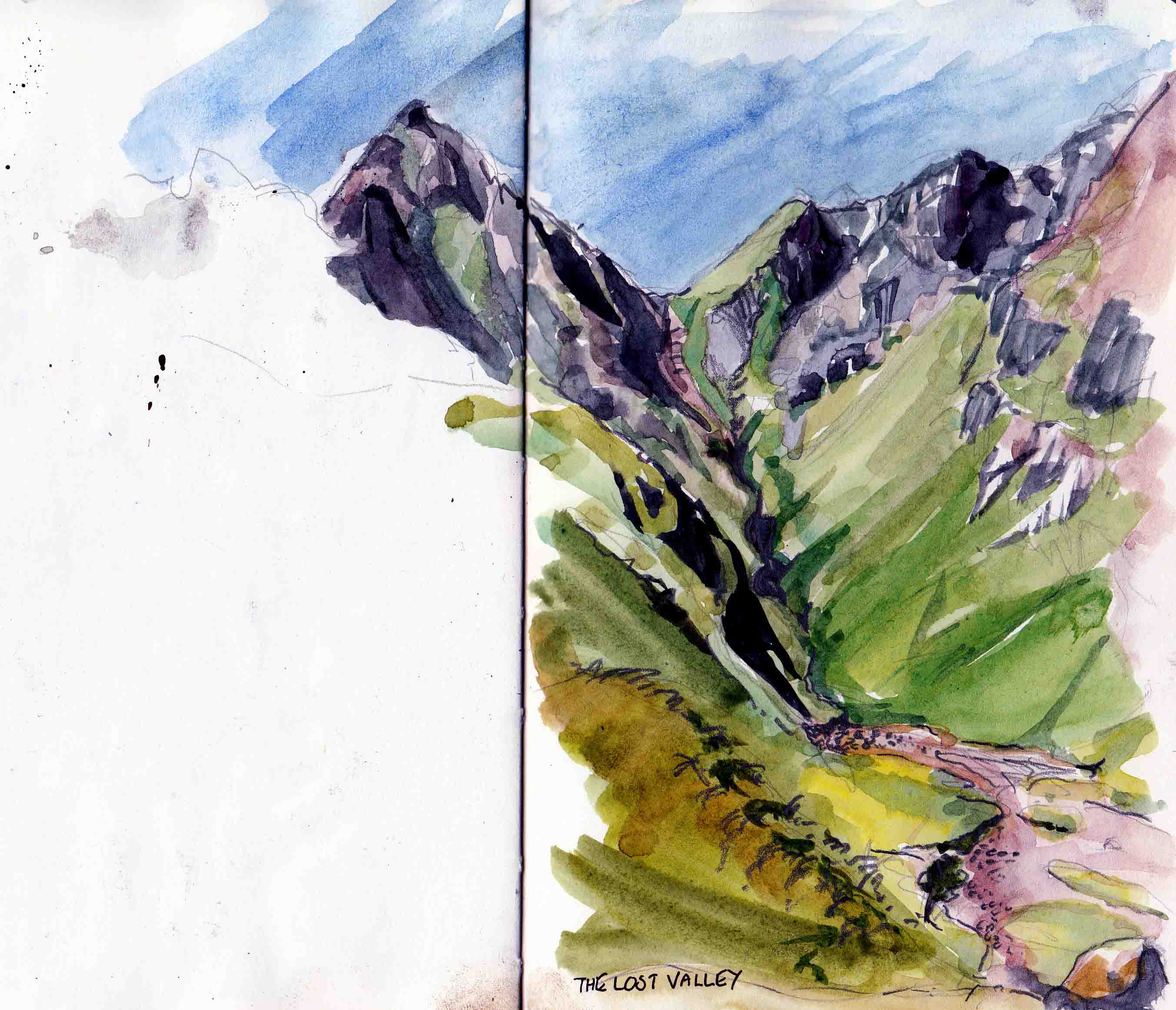 Sadly, the first attempt had to be aborted, as all the car parks were full of tour buses, tripods and people flying drones. The Lost Valley, it appeared, was no longer quite so lost. Not a wasted journey though, we parked further up the pass and walked the path to Buachaille Etive Beag. Time for a quick sketch looking towards A’Chailleach, shrouded in shadow, whilst we basked in the sunshine.