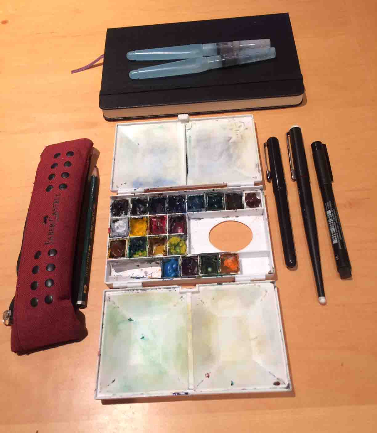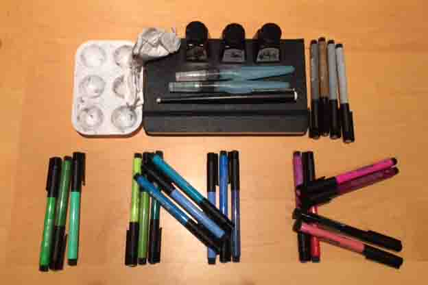 I carry my sketching kit with me everywhere, so I usually keep things minimal. For Inktober I’ve gone deluxe and invested in a sack of Faber-Castell Pitt pens, they are a dream to use on a Moleskine sketchbook, super smooth!