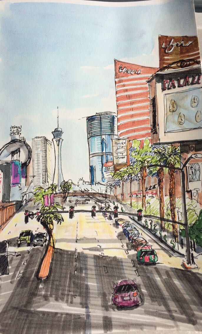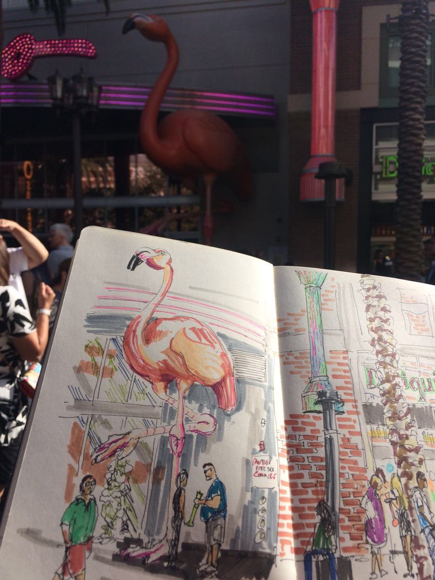 It’s 7pm in Vegas, but my body thinks it’s 3am. I’m standing alone on the strip in Las Vegas, sketching the iconic Flamingo. Midway, a man asks me if I might have any idea where the Uber pick up point is. It’s time to sleep.