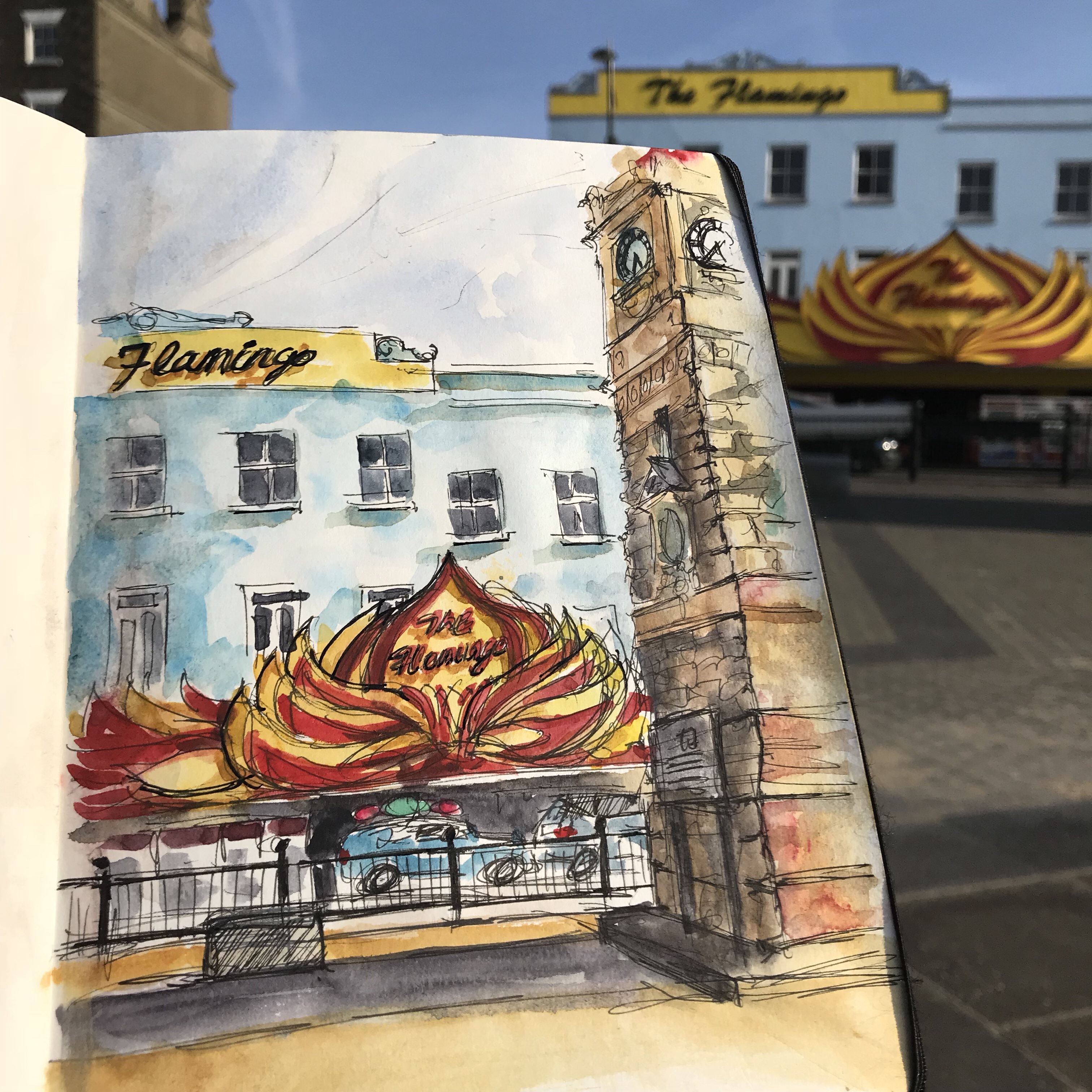 Once I finished the pen work, I eyed up the fancy mosaic floor and decided this was not the place to risk ‘Inktober day five: The return’. So I went round the corner to a safer spot, to finish the ink wash.